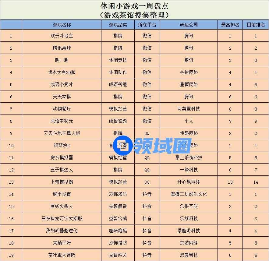 本周休闲游戏方面,微信小游戏榜单及其排名持续稳定,榜单头部仍以经典小游戏为主,其中榜单前三均由腾讯旗下产品囊括,它们分别是棋牌游戏《欢乐斗地主》《腾讯桌球》和休闲竞技类游戏《跳一跳》。同时,《动物餐厅》本周排名上升了一位,当前位于微信小游戏榜单第8名。