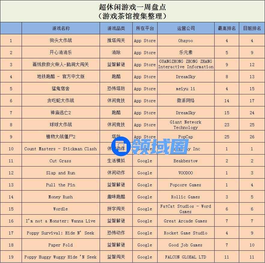 超休闲游戏方面,在App Store免费游戏榜单中,Ohayoo发行的推塔游戏《狗头大作战》空降榜首,乐元素《开心消消乐》和益智游戏《画线救救火柴人-脑洞大闯关》分别拿下了榜单第2和第3名。在Google Play免费游戏榜单中,老游戏《Count Masters - Stickman Clash》登上榜首,模拟玩法的《Cut Grass》和动作玩法的《Slap and Run》分别位于榜单第2和第3名。