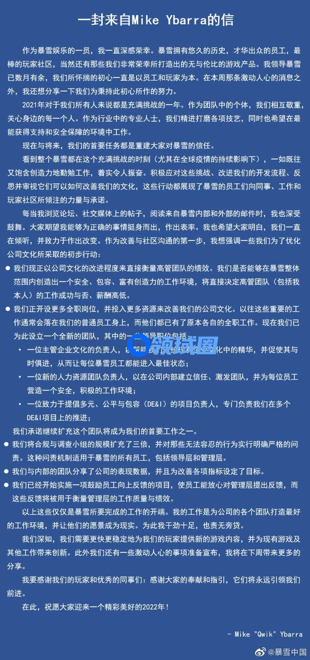 1月21日,在网上讨论热烈的微软收购动视暴雪新闻氛围下,暴雪中国官博公开了一封来自Mike Ybarra(暴雪娱乐部门CEO)的信。Ybarra在信中借由“那条激动人心的消息”来分享了他上任以来对于暴雪以及玩家们的看法,对暴雪即将进行的工作进行了归纳。最后Ybarra透露到,暴雪将在下周为玩家带来全新消息,敬请期待。