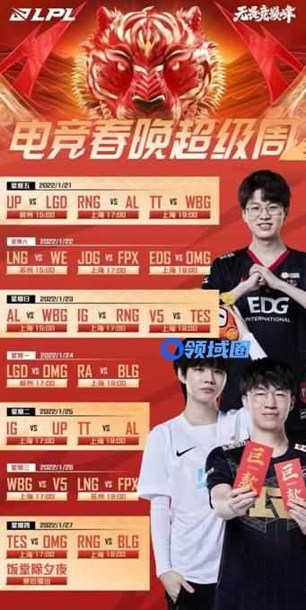 1月21日15点,UP与杭州LGD将展开本次“电竞春晚超级周”的首场对决。两支队伍都希望在如此重要的时间节点斩获赛季首胜,鼓舞全队信心,相信这必将是一场双方拼劲全力的精彩对决;1月22日19点,从S4时期就带来诸多名场面,并且本赛季都有着优秀开局表现的EDG和OMG,将带来传奇队伍之间的对决;1月23日17点,以新阵容来到“电竞春晚超级周”舞台的IG与RNG将迎来新一轮碰撞,究竟谁将技高一筹,让我们拭目以待;1月23日19点,春季赛开赛以来备受期待的TES,将迎战实力不容小觑的深圳V5。而在本赛季转会期,TES前打野Karsa转会至V5,老队友在新舞台重逢,势必将为召唤师们送上更多惊喜。
