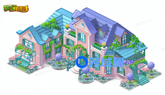 【莫奈花园】主题皮肤的主屋灵感来自于莫奈旧居,绿色的法式古典门窗与梦幻粉的墙壁构成了主体,爬藤植物茁壮生长,覆盖了部分外墙,屋外的花圃种满了郁金香和勿忘草,更显生机盎然。