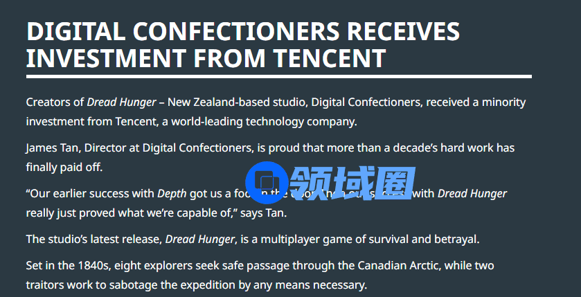 近日,曾推出过多人生存欺诈游戏《Dread Hunger》(恐惧饥饿)的开发商Digital Confectioners发布公告,表示已经获得来自腾讯的少数股权投资。