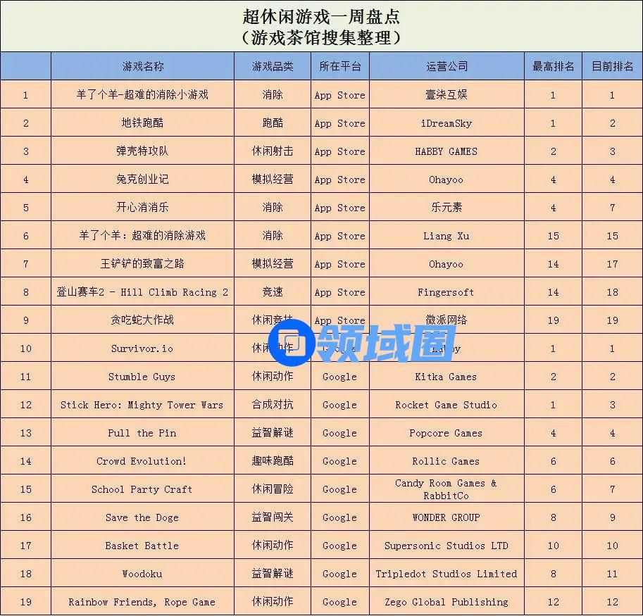 超休闲游戏方面,在App Store免费游戏榜单中,两款《羊了个羊》跻身榜单前列,Ohayoo发行的模拟经营游戏《兔克创业记》跻身进入App Store免费游戏榜单TOP5;Google Play免费游戏榜单中,海彼游戏推出的动作类游戏《Survivor.io》排名上升,并再次登顶榜首。
