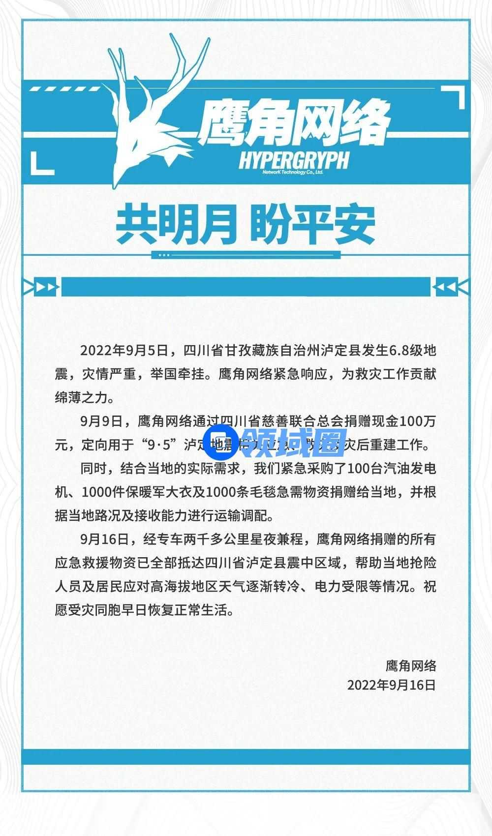 地震爆发后,鹰角网络通过四川省慈善联合总会捐赠现金100万元,定向用于“9·5”泸定地震相关应急、救灾及灾后重建工作。同时,结合泸定灾区的实际需求,鹰角网络紧急采购了100台汽油发电机、1000件保暖军大衣及1000条毛毯捐赠,并根据当地路况及接收能力进行运输调配。