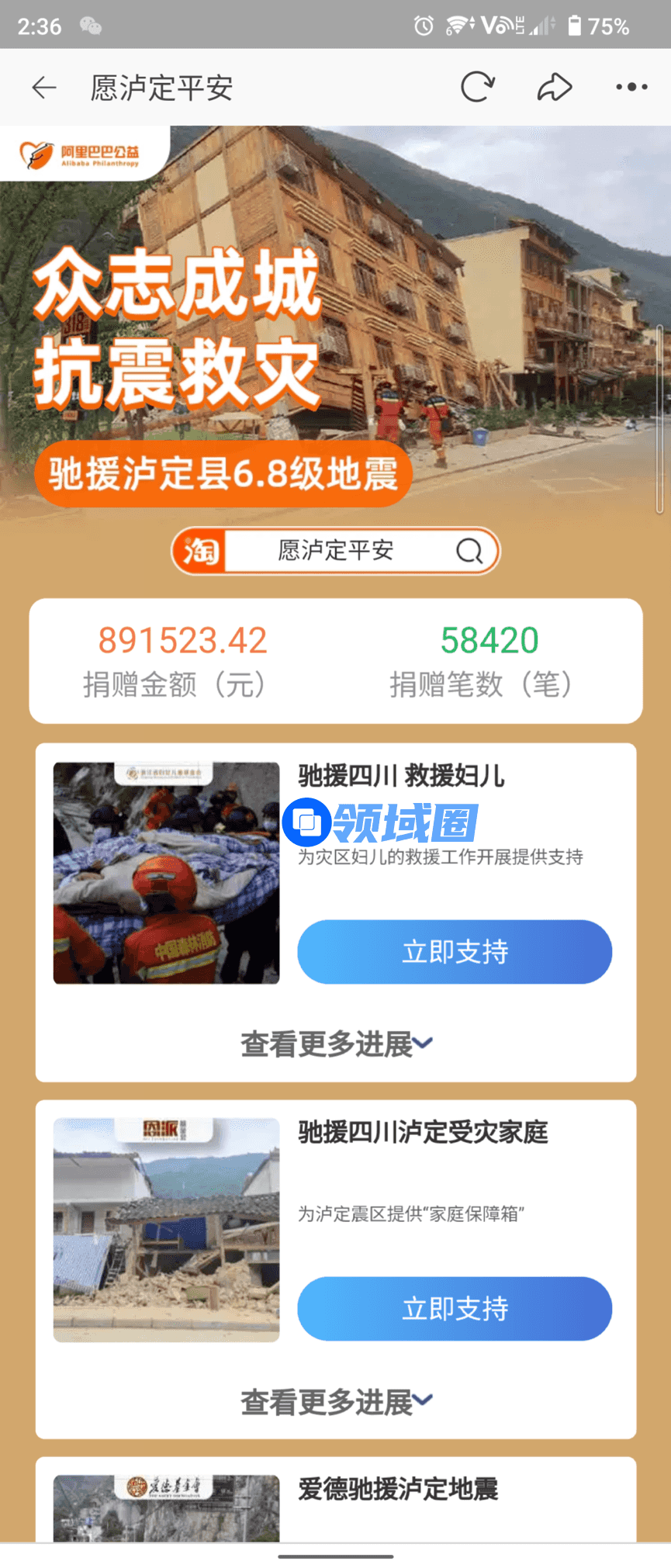 在淘宝搜索“愿泸定平安”,可进入救灾募捐专题页面,截止至9月16日显示收到近6万笔捐赠,总金额近90万元。