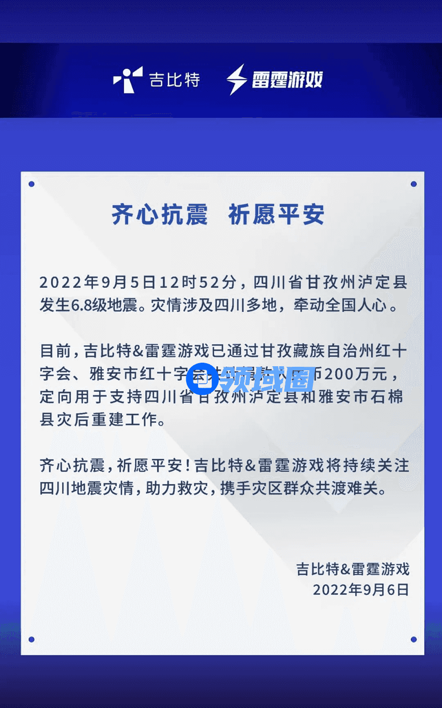 地震发生后,吉比特&雷霆游戏已通过甘孜藏族自治州红十字会、雅安市红十字会共计捐款人民币200万元,定向用于支持四川省甘孜州泸定县和雅安市石棉县灾后重建工作。