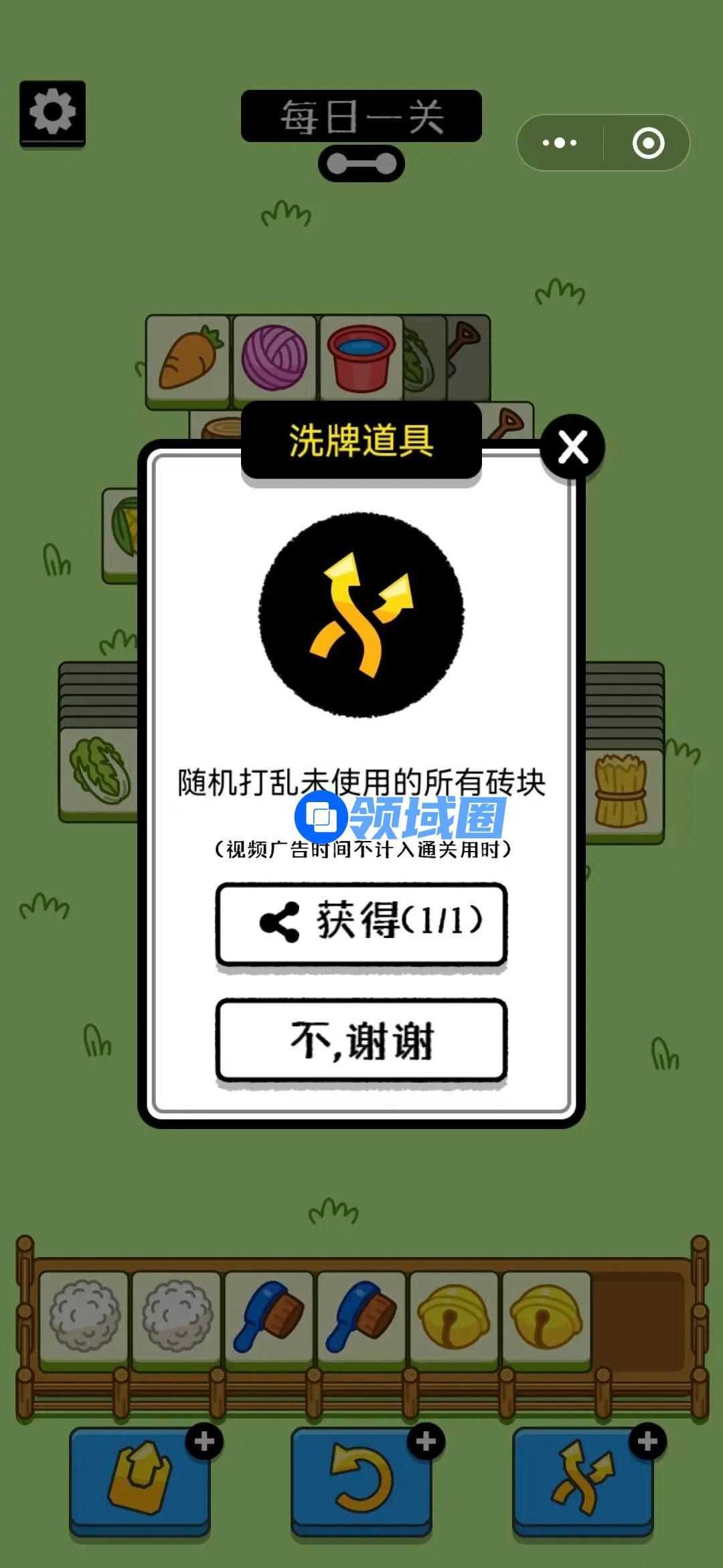 玩家要使用移除、撤回、洗牌三个道具时,需要分享游戏至回话或者群组才能获取道具使用机会,分享又为游戏用户的二次裂变与转化带来了机会。