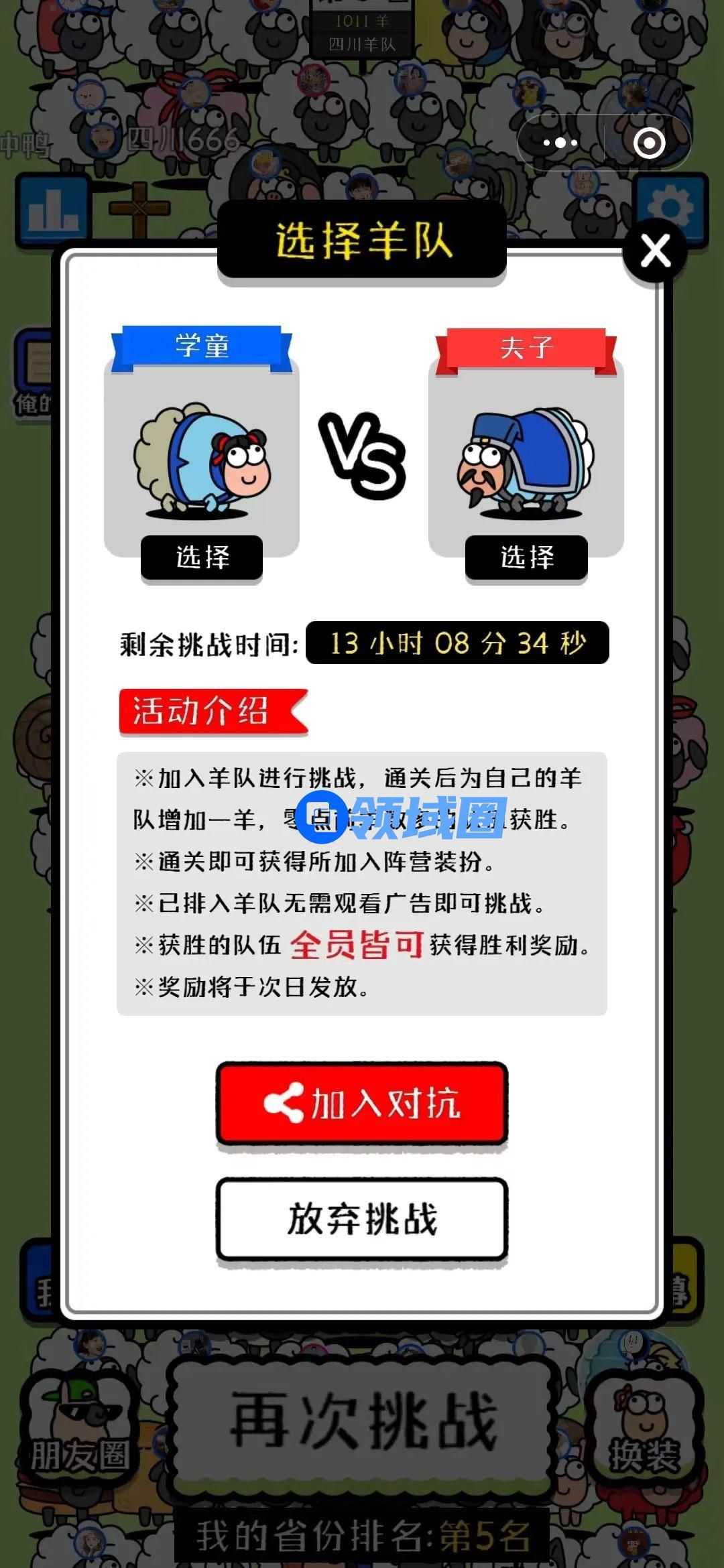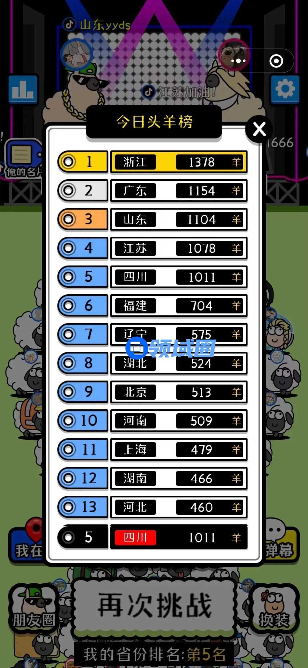 比如今日的阵营挑战,就是按照地域划分的,当前排名靠前的阵营是浙江羊队,广州羊队和山东羊队紧随其后,四川羊队则位列第5名。