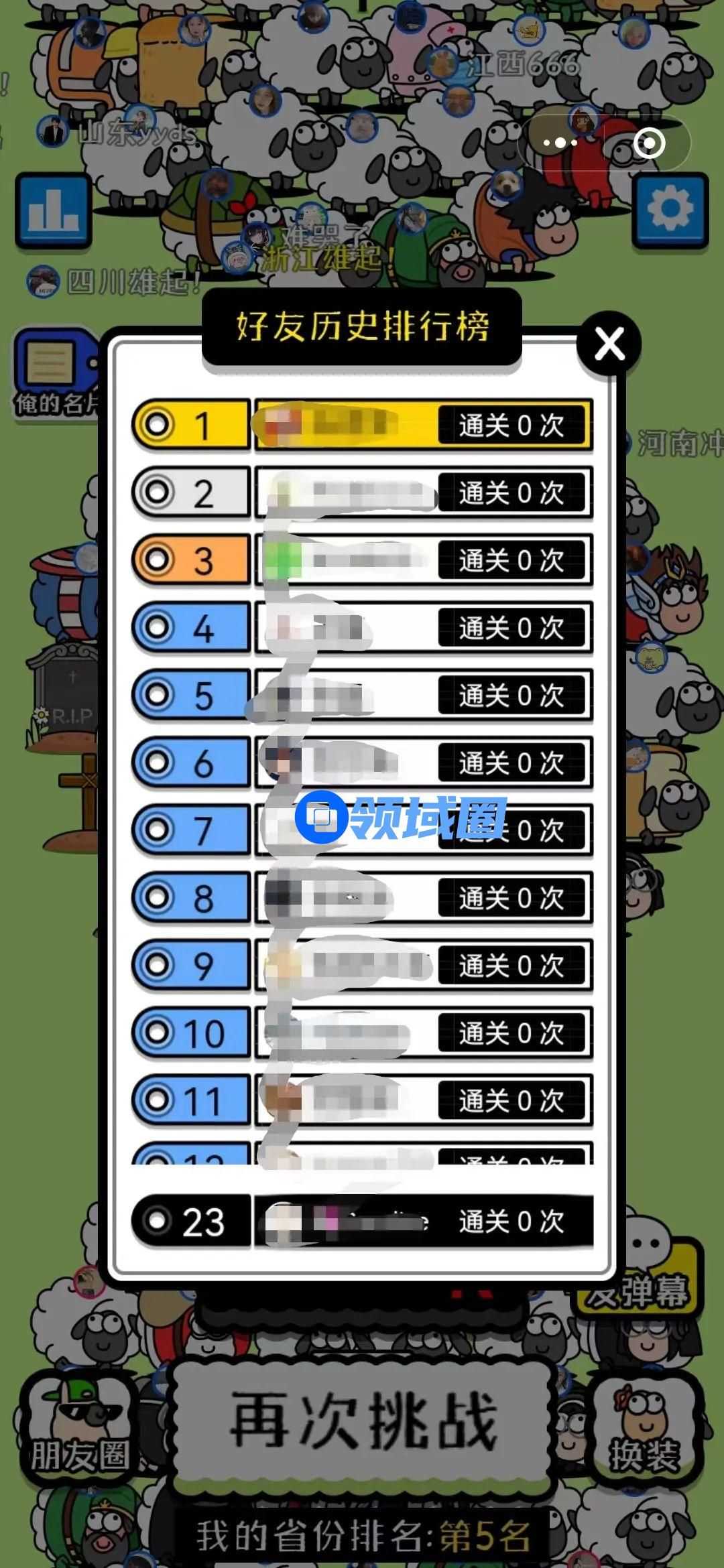 玩家还可以通过点击“朋友圈”按钮,查看微信好友的游戏排行榜。(PS:茶馆的好友目前还没有通关的。)