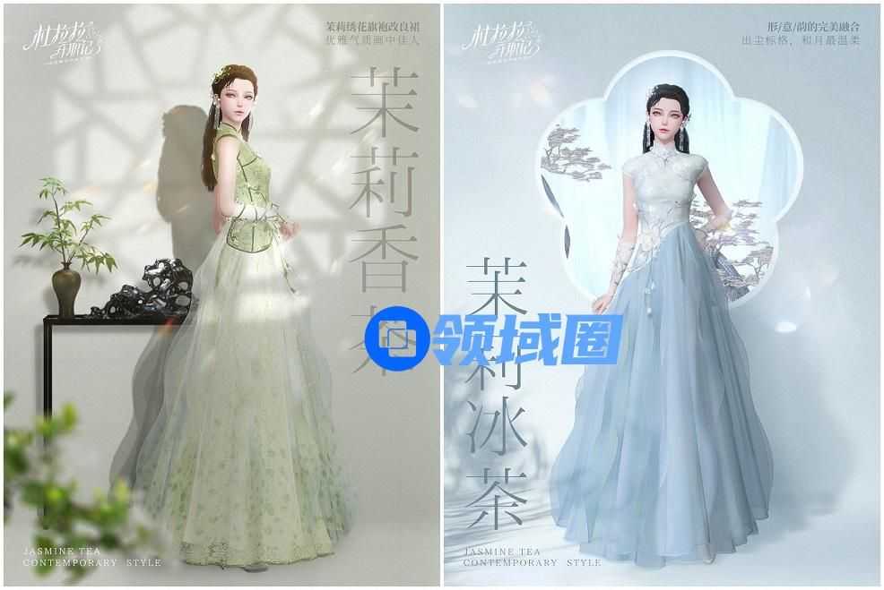 主推的芳茗公馆的活动时装--茉莉香茶,这套服饰则采用了中式旗袍+西式礼服裙的设计,同时糅合了中西方的审美。上半身为中式旗袍,刺绣细节精巧,衣服版型采用了传统旗袍样式,立式斜襟领搭配茉莉花状的异形珍珠扣;腰部设计独特,两侧高低不规则的腰线,在拉长比例的同时,更能显出玲珑曲线;下半身是欧式礼服裙,裙子外罩一层轻透薄纱,波卷层叠,若隐若现;手部饰品为蕾丝透花束袖,丝带与花枝缠绕而上,白色茉莉绽放于指尖,再佩戴一副青玉手镯,古朴动人。