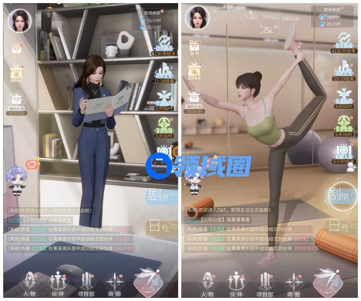 玩法上更加轻松简单且碎片化,玩家可以体验到职场题材不那么生硬的一面。解放双手,闲坐聊天就可坐享收益,在闲暇间尽享都市轻松惬意生活。照顾到女性玩家多场景的社交娱乐方式,上班勤奋打拼偶尔摸下鱼,下班健身房练瑜伽,喝喝咖啡吐吐槽,闺蜜逛街唱K,享受休闲生活,还可以出门旅行娱乐购物,工作生活通通在线。