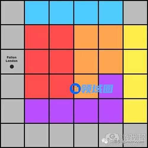 有些tiles总是固定于同样的位置上(灰色的那些),但大多数tiles都能在预先设定好的区域移动(游戏邦注:如红色,蓝色,黄色,橘色和紫色tiles)。限制tiles的布局意味着我们可以有效平衡难度。即伦敦附近的区域将存在于前面到中间的游戏,而地图的东部区域则是面向较后面的游戏内容。