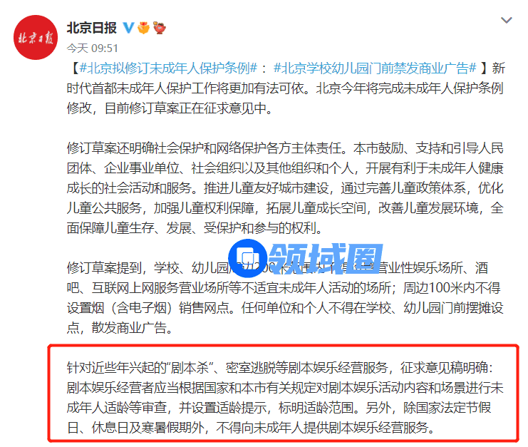 根据北京日报的新闻报道,北京将于今年完成未成年人保护条例修改,目前修订草案正在征求意见中,其中明确提到“针对近些年兴起的“剧本杀”、密室逃脱等剧本娱乐经营服务,征求意见稿明确:剧本娱乐经营者应当根据国家和本市有关规定对剧本娱乐活动内容和场景进行未成年人适龄等审查,并设置适龄提示,标明适龄范围。另外,除国家法定节假日、休息日及寒暑假期外,不得向未成年人提供剧本娱乐经营服务。”