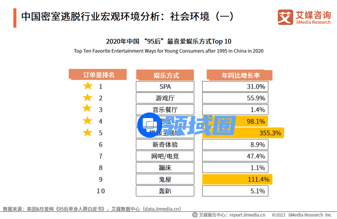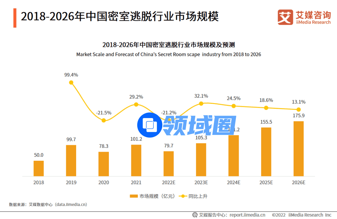 根据艾媒关于“2022-2023年密室逃脱行业分析报告”,密室逃脱行业曾在2019年翻倍增长至百亿规模,但此增长点在2020年因疫情影响下降,目前预计2022年场规模将达79.7亿。密室逃脱也在2020年受中国“95后”欢迎的娱乐方式中排第四名。