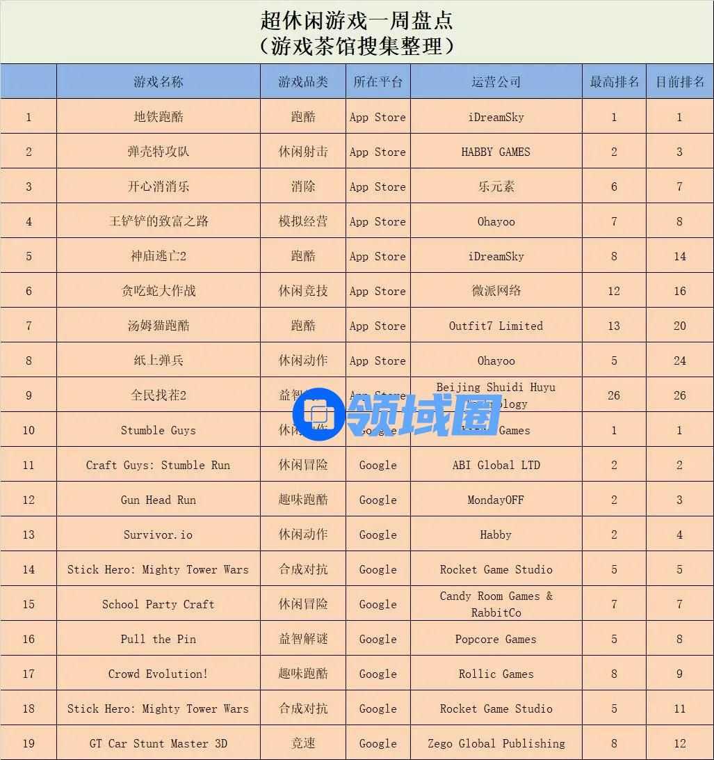 超休闲游戏方面,在App Store免费游戏榜单中,《地铁跑酷》持续第22天稳霸榜单TOP1,海彼游戏发行的《蛋壳特攻队》重稳坐App Store免费游戏榜单TOP3;Google Play免费游戏榜单中,动作类游戏《Stumble Guys》连续第二周稳坐榜首。