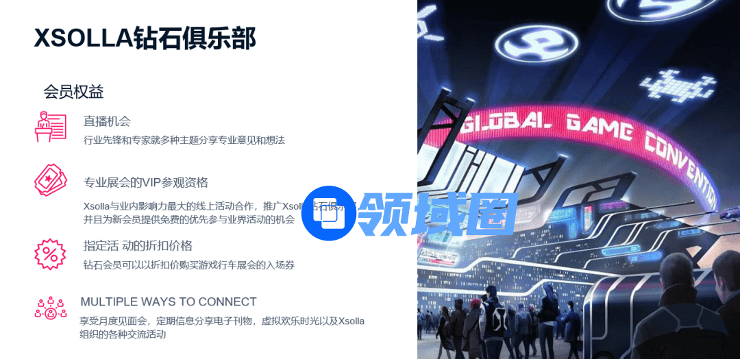 而在全球分销问题上,Xsolla的全球分销解决方案能为游戏厂商带来低成本、多渠道、安全支付等多重优势。Xsolla的钻石俱乐部则专为机构投资者和游戏发行商设计,加入俱乐部能够获得直播机会、专业展会的VIP参观资格、指定活动的折扣价格以及MULTIPLE WAYS TO CONNECT等会员权益。
