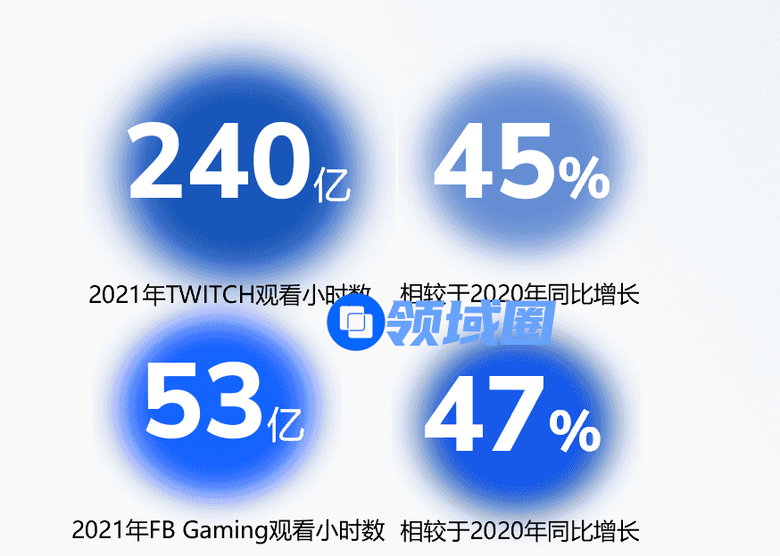 在视频直播层面,2021年Twitch平台上的观看小时数超过240亿小时,相较于2020的170亿小时,同比增加了45%。类似的是,FBGaming相较于2020的36亿的观看小时数同比增加了47%,在2021年达到了53亿。