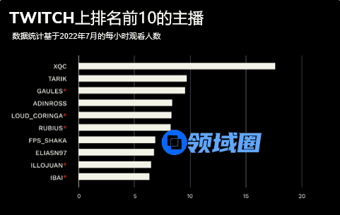 一段时间以来,Twitch 的前10名涌现大量拉丁美洲主播,Gaules 和 Ibai 在今年不同的时间点上都占据过榜首。7月,前10名主播中有一半来自拉丁美洲,这说明西班牙语和葡萄牙语观众对直播的青睐程度很高。