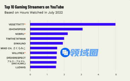 YouTube的7月GamingLive排行榜也反映出一个庞大的拉丁美洲社区,其中西班牙的 Vegetta777 排名第一,巴西的 Nobru 排名第三。