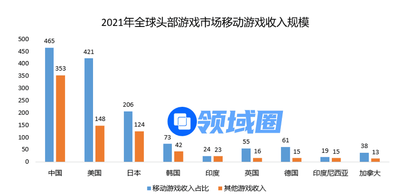 许多游戏厂商认为海外市场发展已经趋于饱和,现在如果选择出海将面临竞争更激励的市场和出海即沉船的风险。创梦天地的联合创始人兼总裁高炼惇则认为,中国手游游戏市场规模领先全球,发行海外依然有较大提升空间。以2021年全球头部游戏市场移动游戏收入规模相关数据为例,如今国内游戏整体收入高于美国、日本、韩国等国家,其中手游的收入占比相较其他游戏收入更为可观。