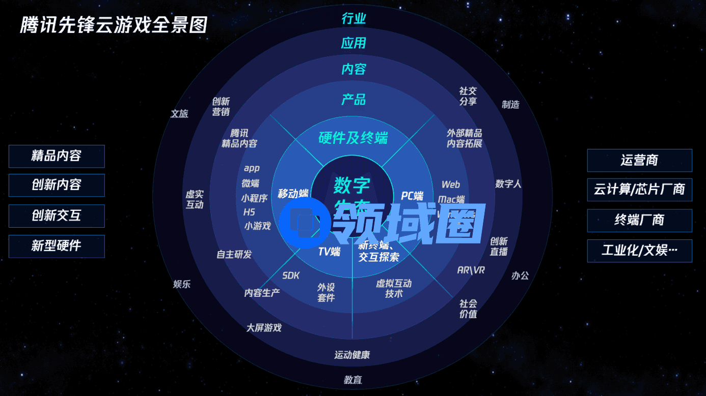 随着核心业务趋于成熟,腾讯先锋也将云技术赋能拓展到游戏之外,形成以“云游戏技术”为核心,涵盖行业、应用、内容、产品、硬件及终端五大圈层的“数字生态全景”,尝试探索在制造、教育、娱乐、文旅等产业的融合创新,为实现数字化生态场景提供助力。