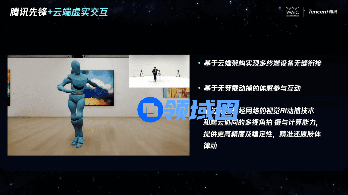 在虚实互动领域,腾讯先锋通过基于云端架构实现多端无缝衔接、通过深度神经网络的视觉AI动捕技术和云端协同的多视角拍摄与计算能力,精准还原肢体动作,让用户通过普通摄像头便可创造三维形象,在VR/AR世界实现云游戏与运动、健身、直播等场景的深度融合,让体验者在虚拟世界中“真实”交会,打破虚拟与现实的界限,获得更深入更沉浸式的体验。
