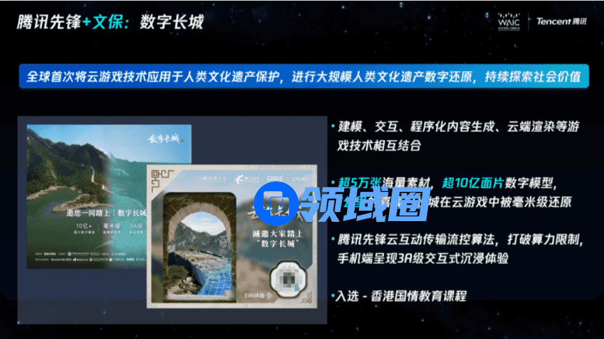 为满足亿万级用户在线游览“数字长城”需要,技术团队通过“云游戏传输流控算法”,实现了手机等移动端呈现3A级的观看效果和交互体验。这是全球首次将云游戏技术应用于人类文化遗产保护,而云游戏的相关技术则正是来自腾讯先锋云游戏。