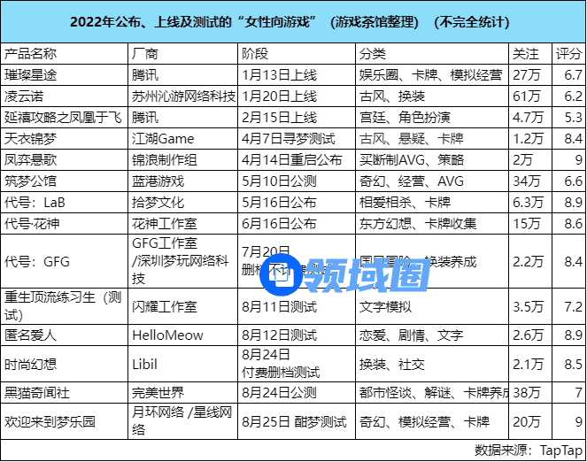 从中可看到,相较于在2020年,大中小厂都欲来分一杯羹,2022年的女性向游戏赛道显得有些冷清。或许受到版号发放影响,除了零星几部游戏上线之外,大多数游戏仍在测试中。