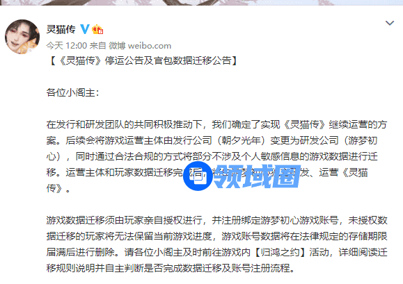此外,今日又有2020年年底上线的古风乙游佳作《灵猫传》发布停运公告,运营主体由发行公司变更为研发公司,直至10月31日正式关服,此后将由游梦初心独立研发和运营。这款游戏曾在7月29日发布公告,称因为团队核心人员流失,计划将在今年年内停止游戏的线上运营。