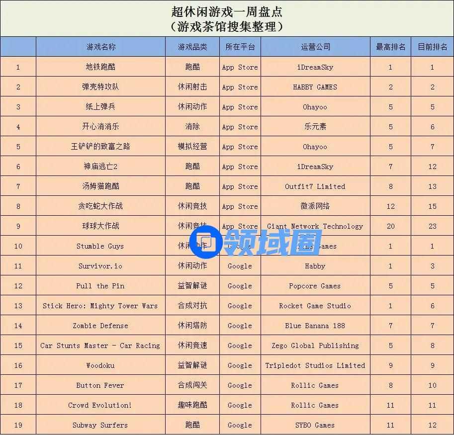 超休闲游戏方面,在App Store免费游戏榜单中,Ohayoo发行的《纸上弹兵》重回榜单前列,登上App Store超休闲游戏榜单TOP3;Google Play免费游戏榜单中,动作类游戏《Stumble Guys》登顶榜首。