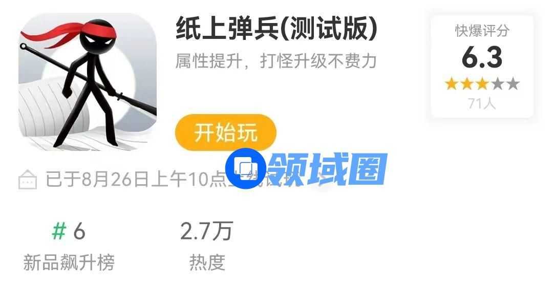 其中,《纸上弹兵》不仅在iOS端获得了不错的成绩,同时该游戏自8月26日在好游快爆上线试玩之后,也迅速登上了新品飙升榜第6名,收获了超2.7万的热度值。