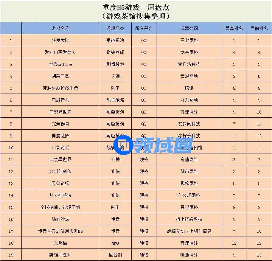 重度H5游戏:《世界online》重回TOP3,《热血沙城》排名上升