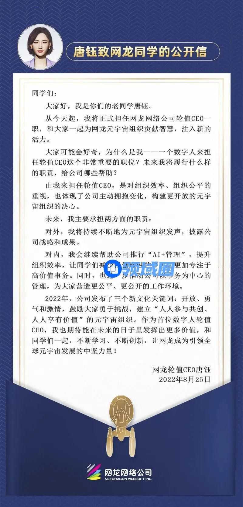 今日,上市游戏公司网龙发布公告,认命AI机器人唐钰为公司的轮值CEO,负责组织管理事务及战略执行,通过构建元宇宙组织,持续优化组织模式、提升管理效率、深化人才策略,以下是唐钰的上任公开信。