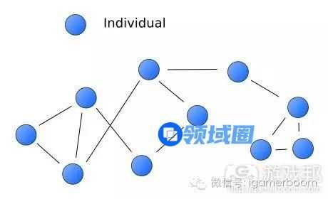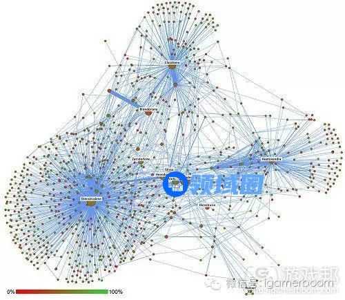 这是一个简单社交联系的例子。在《命运》中,蓝点代表的是玩家,当他们在PvP比赛中一起游戏或对抗时便会在彼此间连起一条线。如果一个玩家更频繁地和同样的人或特定的人游戏或对抗,那么玩家间的合作或竞争联系便会更加紧密。