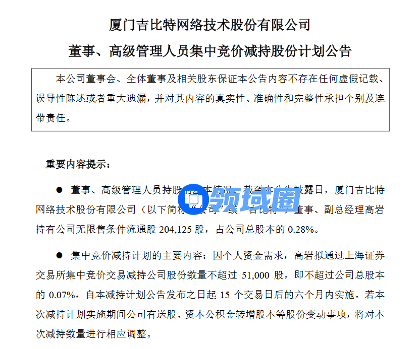 在8月19日晚,吉比特发布《董事、高级管理人员集中竞价减持股份计划公告》,公告称,因个人资金需求,吉比特董事、副总经理高岩拟通过上海证券交易所集中竞价交易减持公司股份数量不超过51,000股,即不超过公司总股本的0.07%,自减持计划公告发布之日起15个交易日后的六个月内实施。