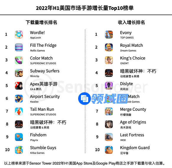 据Sensor Tower数据,今年上半年,在完成V4.0大版本更新后,《Evony》收入大幅上升,直接冲上了2022年H1美国手游收入增长榜单的榜首席位,且就在今年7月,《Evony》在美国地区的双端下载量超300万次,双端流水也突破了3300万美元。