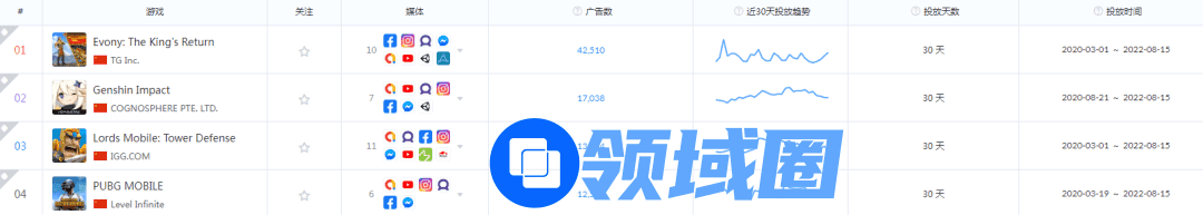 至今,《Evony》的广告投放数量依然十分突出,据App Growing Global统计,近一个月出海游戏广告投放数量榜单中,《Evony》以4.2万条的数量登上榜首,远超榜单第二名的《原神》,且该游戏的广告内容依然以轻度的益智抽棍玩法展示为主。
