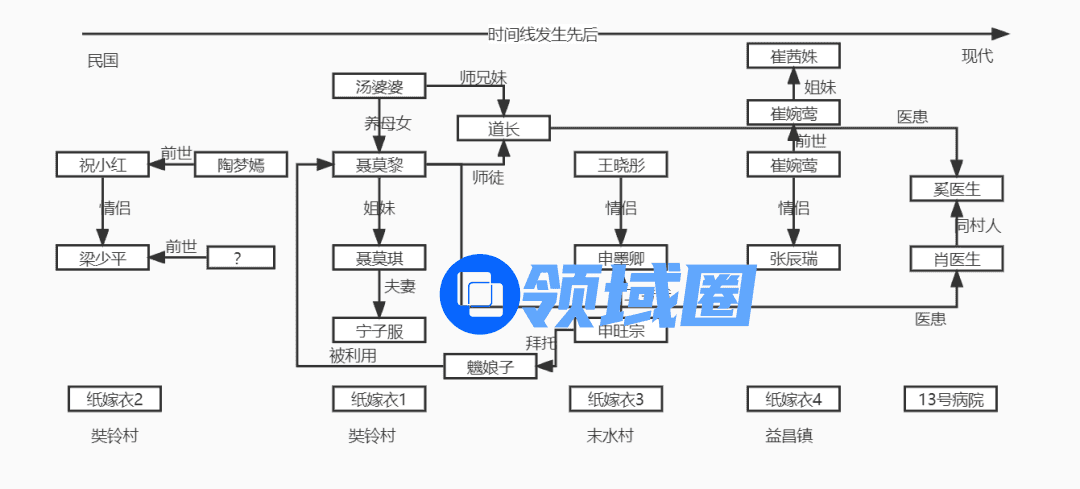 “纸嫁衣”便以莫黎的阴谋诡计,串联起不同章节的故事。首先是在第一部中,装成妹妹莫琪,向妹妹施展夺魂法术,无奈计谋落空来到13号病院。随后靠魕娘子回魂,提前送玉簪给笨蛋情侣,留下一手,使其回末水村,也就是第三部的故事。以及让第二部中,陶梦嫣之所以会回奘铃村,也是莫黎给陶怼怼在学姐的心理咨询处做了手脚。最后是与奘铃村相关的13号病院,在非法实验和相关邪典影响下最终荒废。