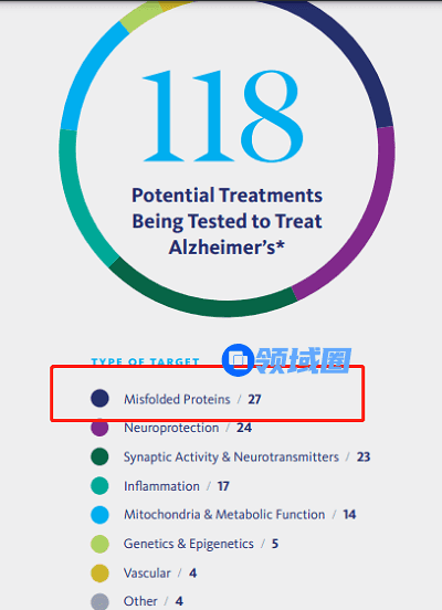 据美国阿尔茨海默症药物发现基金会2021年鉴显示,去年全美共有118项阿尔茨海默症新疗法正在临床试验中,而其中有27项新疗法靶向错误折叠蛋白(β-淀粉样蛋白、tau蛋白等),占比19%。而2018年时,靶向错误折叠蛋白疗法的占比达到28%。