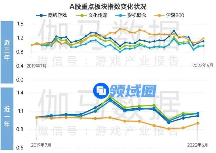 与近似产业比较,游戏产业的投资回报相对较优。2022年6月A股游戏板块股价指数为1.11,虽然弱于沪深300,但高于文化传媒与影视概念板块。