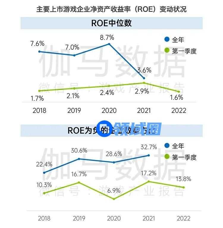 与自身比较,游戏产业近期的发展状况有所下滑。从滚动市盈率来看,36.7%主要上市游戏企业市盈率为负值;从ROE来看,2021年全年ROE中位数下降近6成,2022年第一季度降幅也超4成。