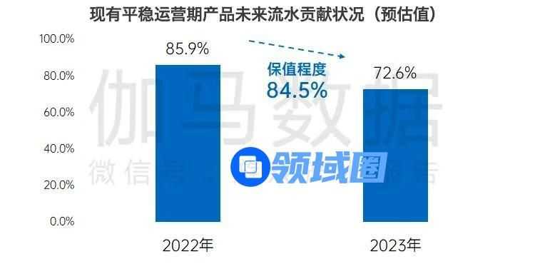 从贡献比例的成因来看,现有平稳运营期产品2023年总流水有望达到今年全年的84.5%,即保值程度为84.5%,这意味着较高的现有产品流水占比主要基于长线运营达到,而非新品数量减少释放的市场空间。因此由平稳运营期产品构筑的收入基础有望长期延续。