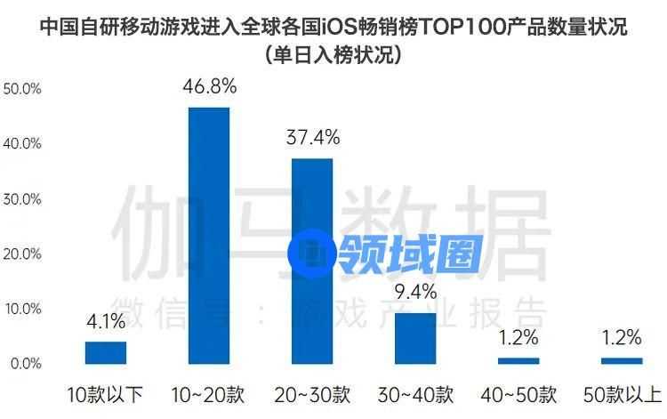 提升产品质量是中国游戏企业从海外市场创收的重要手段,在头部产品的带动下,中国自研产品在95%的国家头部榜单中入榜10款以上产品。现阶段,仅约一成的国家头部榜单中有3成以上产品来源于中国自研,中国游戏企业提升空间仍较大。而随着更多企业对游戏精品化的认同与投入,腰尾部产品的质量将逐步提升,进而带动出海收入增长。
