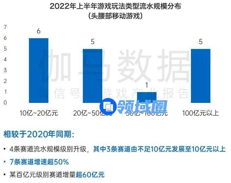 细分赛道是用户需求的产物,由于用户需求不断发展,细分赛道也将随之成长,进而成为产业增长点的重要来源,现阶段头腰部移动游戏市场中已有17条玩法赛道半年流水超10亿元。未来,细分赛道或将从两个方面为产业提供增长支撑,一方面,新增细分赛道意味着新的增量来源,在细分赛道持续涌现的当下,增长来源仍在扩大;另一方面,在存量用户需求的支撑下,发展较为成熟的赛道依然具备成长空间,例如某百亿元级别赛道,2022年上半年较2020年同期的增量超60亿元。