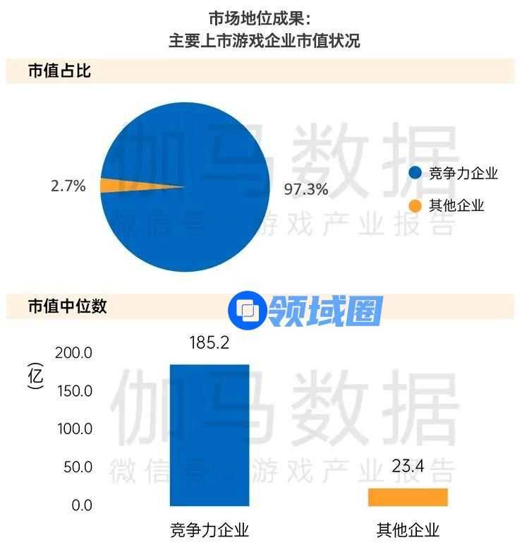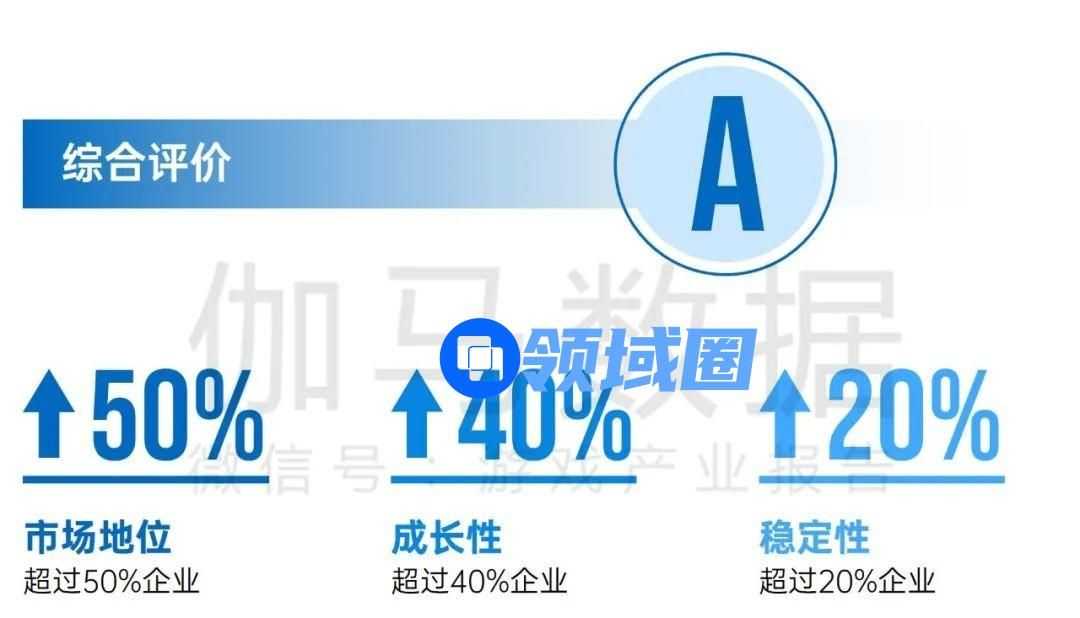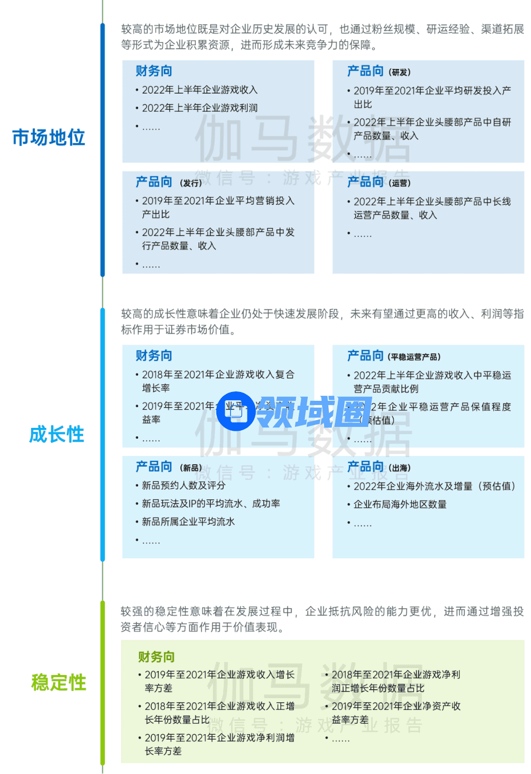 产业投资价值的基础上,伽马数据选出产业内部表现较佳的上市企业作为竞争力企业,产业潜力与个体能力相结合,竞争力企业有望释放更高的市场潜力。企业竞争力的评估上,伽马数据从市场地位、成长性、稳定性三方面建模,其中市场地位主要衡量现有成果及资源积累,成长性主要衡量预期发展速度,稳定性主要衡量风险抵抗能力。
