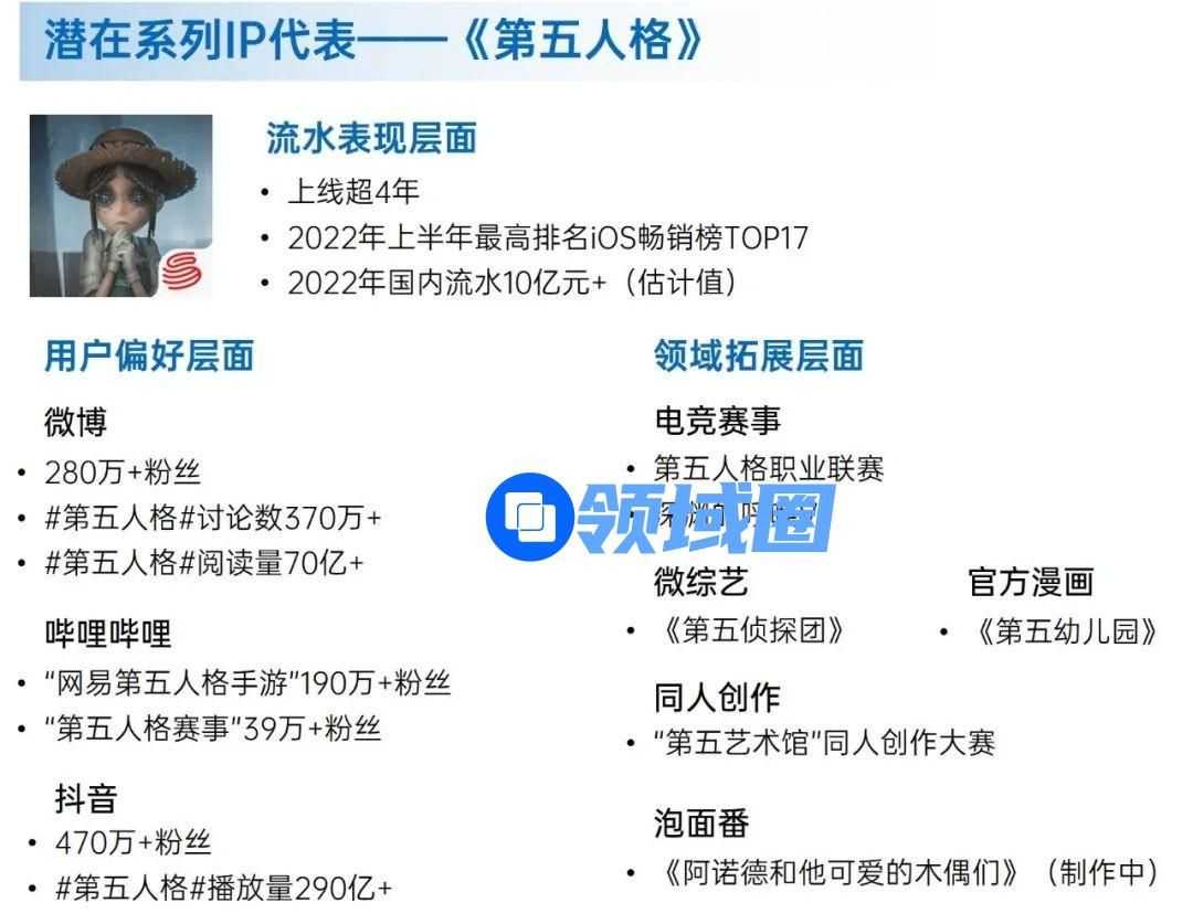 据伽马数据统计,2022年上半年网易游戏的游戏收入中“梦幻西游”“大话西游”“阴阳师”三项原创系列IP的贡献是企业收入的重要来源,也是企业精细化运营策略的成果体现。成熟的系列IP既具备长生命周期,又可借粉丝偏好抬升新品热度,因而兼具流水稳定性与促进作用。伽马数据认为,打造原创IP系列将成为网易游戏的长期增长点,原因主要有二:一方面,网易游戏打造系列IP的经验较为丰富,现已产出多个案例;另一方面,长期的IP布局已为网易游戏提供了较多系列IP备选,例如“第五人格”,在多个平台拥有超百万的粉丝量级,IP储备较为成熟,有较高的长期开发潜力。