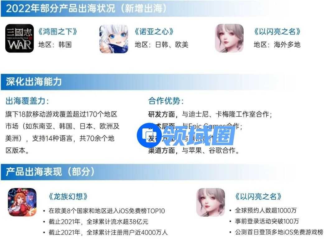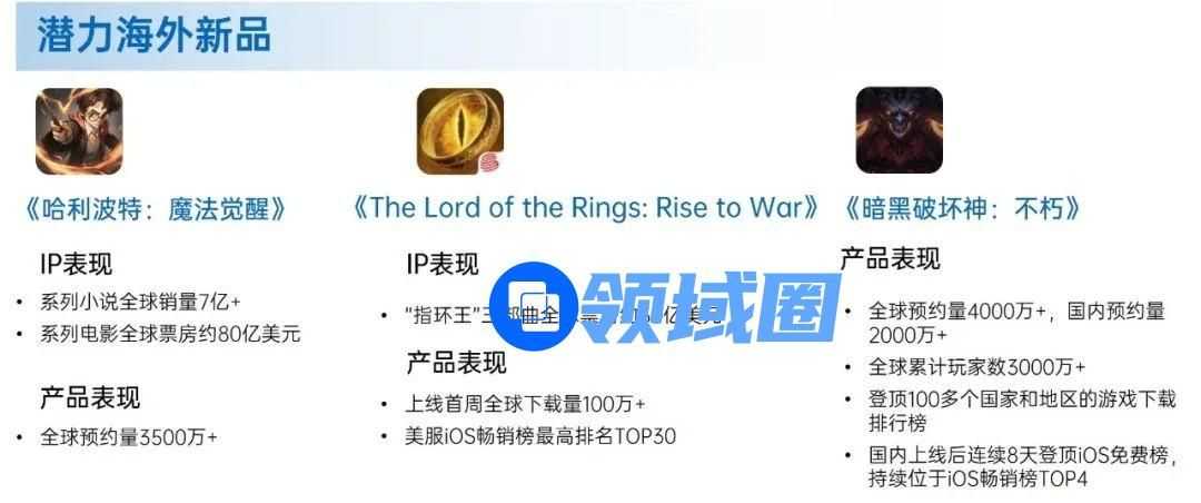 在2019至2021年复合增长率达16.3%的情况下,网易游戏海外收入的占比始终超过10%,已成为企业快速增长的重要支点,伽马数据认为未来海外收入仍将成为网易游戏增长的重要来源。在已有产品层面,网易游戏的IP联动、KOL合作等区域性本土化运营策略愈发成熟,有望维持主力出海产品流水的稳定。新品方面,具备全球化IP的产品值得重点关注,例如《暗黑破坏神:不朽》;此外,《哈利波特:魔法觉醒》《The Lord of the Rings: Rise to War》等产品也在逐步拓展出海进程,基于国内历史流水数据,其未来海外流水表现或值得重点关注。