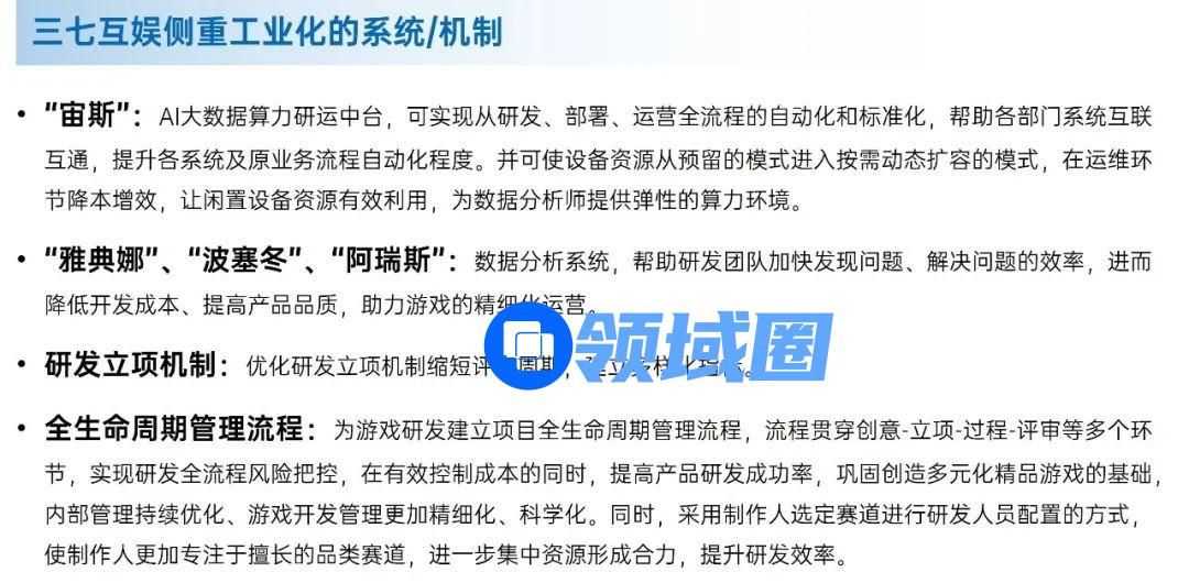 强化自研能力是近年来三七互娱的布局重点,并在研发人员密度、研发费用投入等方面有所体现,现阶段,三七互娱的自研能力已取得较大提升,据伽马数据统计当前企业移动端收入中由自研产品贡献的比例已超过60%,成为收入的主要来源。而在研发经验逐步丰富的同时,三七互娱以系统的形式将其沉淀,并根据真实产品及用户反馈持续迭代,现阶段已产出“宙斯”等研发系统,以工业化解放游戏生产力。伽马数据认为,这将成为三七互娱长期增长的支撑能力,这是由于工业化“缩短研发时长并保持品质”的特点将使企业现有优势延续至新品中,提升新品表现预期,而三七互娱擅长的数值型游戏与工业化适配性较高,有望提升版本迭代速度与质量,进而扩大运用工业化系统的实际效果。