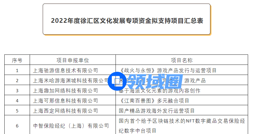 据了解,本次专项资金扶持项目是为了巩固疫情防疫成果,加快文创产业恢复和重振,服务“上海文化”品牌建设,彰显徐汇区“海派之源”新标杆文旅品牌特色。除了上述入选的游戏公司项目之外,还包括NFT数字藏品,元宇宙智慧生活等新型产业,其他大部分则是与文旅相关的产业,共有40个项目在本次公示。