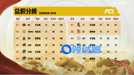 本周周中赛,各支豪强跻身榜单前列展开积分大战,力争头名晋级周决赛。NH战队在周中赛的战神榜竟现三人齐榜:MMing选手、Nannnnn选手、ZpYan1选手分别占据战神榜前三名,帮助队伍拿到132分一骑绝尘头名晋级周决赛;Tianba战队本周展现前所未有的状态,主动出击,以勇猛之姿从其它豪强手中夺得110分高居第二;DDT战队再次带给我们惊喜,以106分压过4AM战队排在第三,轻松直达周决赛;此外同样晋级的战队有PeRo战队、TYLOO战队、17战队和DT战队。